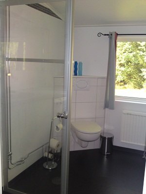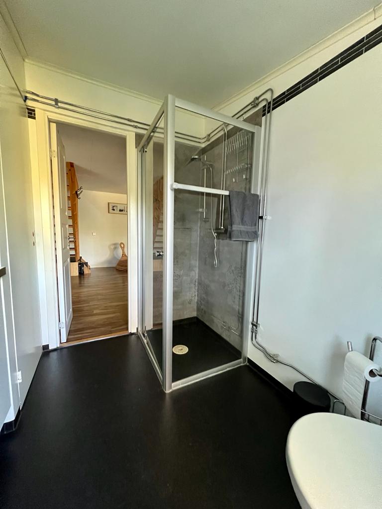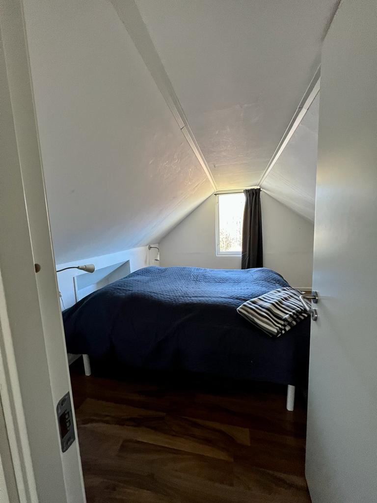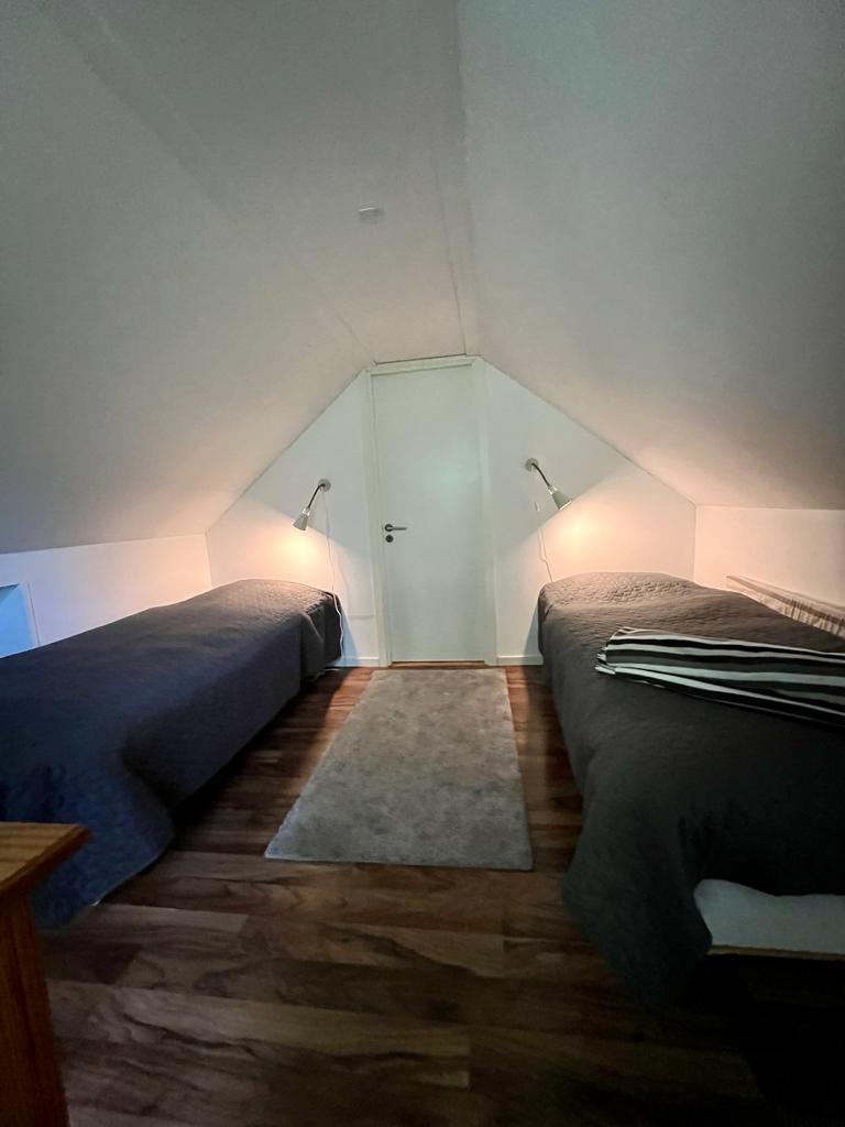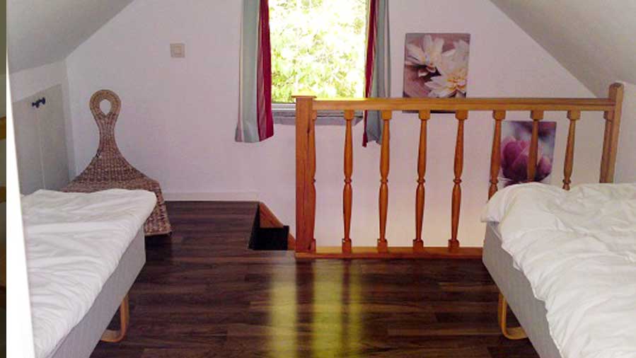 Das Obergeschoss besteht aus zwei kleinen Schlafzimmern (eines als Durchgangszimmer) mit insgesamt vier Betten. Ergänzt wird das Ganze mit einem Bad mit Dusche, WC, Waschtisch und Waschmaschine.